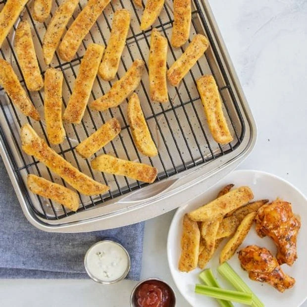 Een extra diepe bakplaat van 44cm x 32cm x 2,5cm met rooster, dat is de Large Cooking Tray van Nordic Ware. In Amerika is dit dé manier om spek krokant te bakken voor het ontbijt. Je legt de plakken op het rooster en het vet valt in de bakplaat eronder. De warme lucht kan zowel bij de onder- als bovenkant met als resultaat; plat, perfect gegaarde beacon zonder ze om te hoeven draaien. Op dezelfde manier wordt ook fruit gedroogd of patat krokant gebakken. De bakplaat is natuurlijk ook zonder rooster te gebruiken.